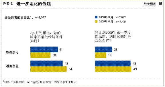 麥肯錫公司最近的調查顯示,在過去一個月中,高管們對其企業前景明顯地感到更為悲觀,認為其國家經濟前景黯淡的感覺也更加強烈1。略高于半數的人預計,明年第一個季度將會出現通縮,而在過去的一個月中,經濟不景氣對發達國家市場的沖擊似乎也更加猛烈,比例高得多的發達國家高管稱經濟環境“顯著惡化”。