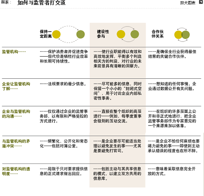 實際上,當企業在嘗試與監管者打交道時,有三種可供選擇的方式(見圖表)。它們可以與監管者保持一定距離,經常處于對抗關系——盡可能減少與監管者溝通交流,敷衍應付其要求,并采用合法手段(如上訴和質疑)進行對抗。而在另一個極端,它們也可以設法與監管者建立合作伙伴關系。根據企業的觀點,這兩種模式通常都不是最佳方式。保持一定距離的方法使企業很難與監管者達成妥協,從而會產生對抗性。而合作伙伴模式必定會失敗,因為監管者本質上是“警察”而不是“伙伴”。一種比較好的方法——而且不僅是在經濟危機時期——是開誠布公地進行對話,目的是與監管者建立具有建設性的關系。盡管雙方的分歧是難以避免的,但無論從戰略上還是戰術上考慮,企業仍然可以從建立互信和培養長期協作關系中獲益非淺,雙方不僅可以在一些較小的行業問題上進行協作,也可以在一些可能涉及較大社會政治范圍的問題上進行協作。