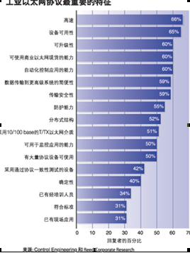 在被問及的34個特征選項中,高速能力(66%)被列為最為重要的特征。緊隨其后的依次是設備的可用性(65%)、可升級性(60%)、可使用商業以太網現貨的能力(60%),以及用于自動化控制應用的能力(60%)。