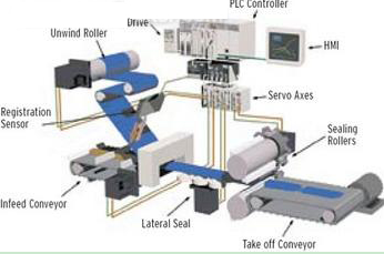 利用PLC和I/O模塊、電機驅動控制器和多軸控制器的一個實例是典型的包裝應用,這種應用包括一個用于卷繞材料的退繞輥子、一個用于傳送需要包裝物品的進料裝置,以及一些封口位置和一個完成包裝后移走物品的傳送裝置。