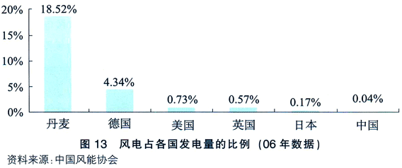 隨著社會電力需求上升和化石能源價格高漲的矛盾日益突出,各國都積極加大對可再生能源的發展力度。美國(5244MW)、西班牙(3522MW)及中國(3449MW)位居前三名,2007年全球累計風電裝機容量為94112MW,增長26.8%,超出GWEC之前預估的22.6%,其中中國07年累計的風電裝置容量已達6050MW,擠下丹麥成為世界第五位風力發電國,以地區別來看,歐洲仍是風電最普及的區域,2007年占比仍高達61%,但亞洲及美國則是未來三年風電市場增長動能主要來源,預估08年全球風電新增裝置容量將可維持在25%以上。 風電占各國發電量的比例見圖13。