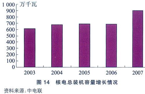 根據2020年中國GDP翻兩番的發展目標估計,國內約需發電裝機容量10億-14億千瓦,而到2008年已有裝機容量僅為8億千瓦,占全國電力總裝機僅1.27%,同法國的75%、美國的27%還有很大差距(見表三)。在鄰國日本,核能已經是準自給能源,日本核能發電能力儲備達半年之久,而中國目前只有數日。在未來十幾年間,將新開工建設40臺以上的百萬千瓦級核電機組,運行核電總規模相當于20個大亞灣核電站。