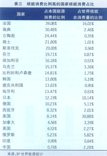 據統計,目前全世界有201家核電廠,共有442座正在運作的核反應堆機組,分布在31個國家。其中,排在前三位的美國、法國、日本就分別擁有104、58和55座反應堆機組,占了全球反應堆機組總數的半壁江山。從核電占電力供應的比重來看,全球范圍占16%,在歐洲,核電的比重可達到34%,其中作為核能發展和運用大國的法國,核電占總發電量的80%,使法國不會再重蹈上世紀兩次石油危機時期因嚴重依賴石油進口而導致本國經濟受到嚴重打擊的覆轍。目前世界有16個國家的核電在國家電力生產中的比例超過 20%。世界核能消費在總能源消費中的比例見圖15。核能消費比例高的國家核能消費占比見表三。