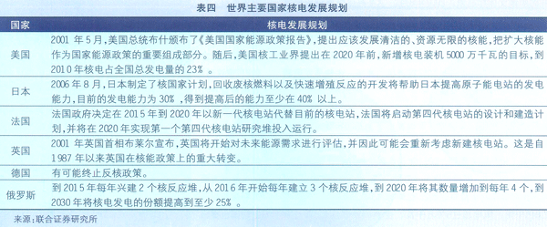 目前世界對能源需求不斷增長,2030年前出現新的可替代能源的可能難以預計,而核能是解決能源危機最為現實的手段之一。到2030年,全世界將有600座新的核電站投入使用,這要求國際社會加強在核能領域的合作。世界主要國家核電發展規劃見表五。