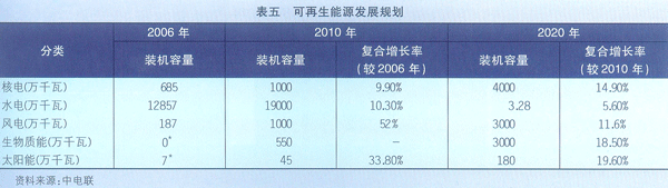 2008年3月《可再生能源發展“十一五”規劃》對該目標進行階段性目標的細化與調整,明確提出了至2020年我國可再生能源發展的指導思想、主要任務、發展目標、重點領域和保障措施。按照相關規劃,2010年,可再生能源占比達到10%,2020年達到16%,而目前這一比例尚不足1%。到2010年我國可再生能源年利用量將達到2.7億噸標準煤。其中,水電達到1.8億千瓦,風電超過500萬千瓦,生物質發電達到550萬千瓦,太陽能發電達到30萬千瓦。未來,我國電力裝機容量中,水電、核電、新能源的占比將上升。到2020年建成水電3億千瓦、風電3000萬千瓦、生物質發電3000萬千瓦、太陽能發電180萬千瓦、建成太陽能熱水器面積3億平方米、沼氣年利用440億立方米、生物質成型燃料5000萬噸。積極發展非糧生物液體燃料,到2020年形成年替代1000萬噸石油的能力。規劃把“加大財政投入,實施稅收優惠政策”作為可再生能源開發利用的一項原則確定下來。