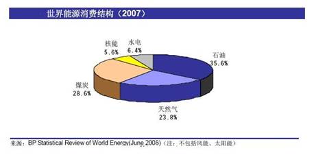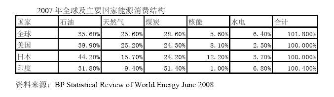 在經歷過三次石油危機沖擊后,水力、核能、風能、太陽能等新能源也不斷被人類所利用。目前,世界能源形成了以石油、天然氣、煤炭為主,水力、核能、風能、太陽能為輔的能源消費格局。2007年全球能源消費結構(見圖1、表1)中,石油平均占35.6%(比2006年35.8%下降0.2%)、天然氣平均占25.6%(比2006年23.7%上升1.9%),煤炭平均占28.6%(比2006年28.4%上升0.2%),核能平均占5.6%,水力平均占6.4%。目前—次不可再生能源石油、煤炭和天然氣共占能源消費的80%以上,仍然在能源格局中處于主體地位。