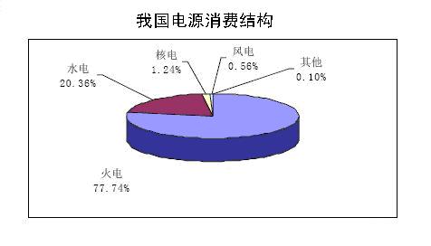 我國2007年的能源消費結構(見圖3)中,石油所占比例為20.8%(2006年為21.1%),天然氣占比例為3.3%(2006年為3.0%),煤炭占70.4%(2006年為69.70%),核能占0.70%,水電占5.9%(2006年為5.50%)。我國的能源消費以煤炭為主,自20世界90年代后總體呈現占比下降趨勢。我國電源結構(見圖4)以火電為主,水電、核電、風電、太陽能發電所占比重較少。