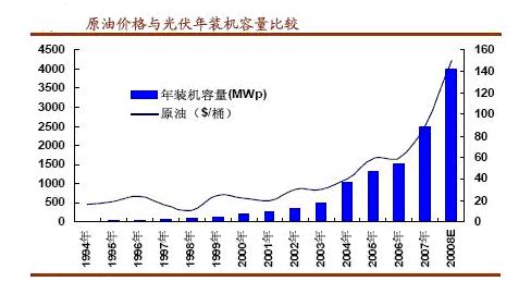 由于目前新能源在國內外能源結構中占比較少,暫時對高油價的影響不大。但高油價刺激了新能源的發展,刺激了新能源發展政策的出臺,人類正在加快腳步進入新能源時代。油價上漲與光伏發電年裝機量存在較大的關聯性(見圖6:原油價格與光伏年裝機容量比較),太陽能光伏系統年安裝量有隨著原油價格上漲逐年上升的趨勢非常明顯。