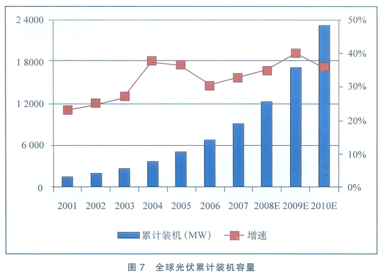 2007年全球光伏組件及系統新增裝機容量2249MWp,同比增速達40.74%,全球累計光伏組件裝機容量(見圖7)為9100MWp,同比增速為32.83%,2000~2007年間,全球光伏累計裝機容量年復合增長率達到30.83%,全球光伏業產值達172億美元,增長態勢迅猛。