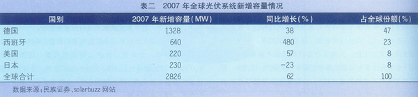 2007年歐洲光伏裝機市場容量占到全球的70%,成為目前全球光伏業最大的消費市場;德國2007年新增裝機容量1328MWp,同比增長38%,占到了全球光伏系統新增容量的47%,西班牙則緊隨其后,以517.27MWp的新增容量占據全球第2位,同比增長達到了驚人的465.6%;此外,美國市場也表現顯著,07年新增容量220MWp,同比增幅超過了57%;日本市場同比下降23%,市場表現偏弱。2007年全球光伏系統新增容量情況見表二。