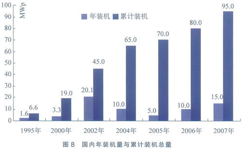 2007年,我國光伏發電設備新增裝機容量26MW,僅比上年增長16MW,較低的基數反映在數字上卻是驚人的160%的增長,累計光伏裝機容量為106MW,同比增長32.5%,與全球裝機容量的平均增速持平,但只占全球總裝機容量的1.16%。然而,我國光伏實際產能僅次于日本和德國,居全球第三,90%以上的光伏電池組件和系統銷往國外,我國的光伏產業己出現了典型的產業與市場倒掛現象。國內年裝機量與累計裝機總量見圖8。