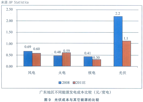 目前,由于太陽能與風能發電成本仍居高不下(見圖9),一時間難以大規模快速發展,只能在政策的扶持下取得階段性試驗性發展。隨著國際原油價格的持續攀升,及太陽能與風能發電技術的逐步提升,這一進程將大大縮短。