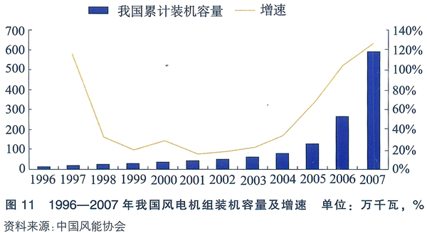 根據中國風能協會提供的統計數據,截止2007年底,我國(臺灣地區除外)新增風電機組3155臺,新增裝機容量達330.4萬KW,同比增長147.1%;2007年底累計風電機組6469臺,裝機容量達590.6萬KW,風電場158個,分布于21個省(市、區和特別行政區),較2006年增加了6個省市(北京、山西、河南、湖南和湖北),累計裝機容量同比增長127.2%,2007年共計上網電量約52億KWH。這些數字遠遠超出先前預期。 1996—2007年我國風電機組裝機容量及增速見圖11。