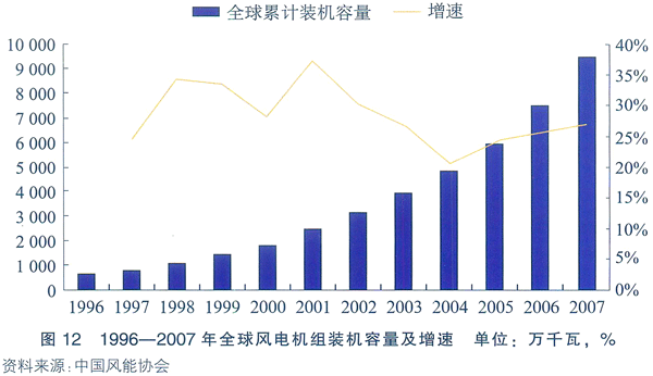 根據GWEC(全球風能理事會)的數據,2007年全球新增風電裝機容量達2007.3萬千瓦,同比增速32.1%,累計裝機容量為9429.6萬千瓦,同比增速達27.04%,超出GWEC的預期增速22.6%近5個百分點。風電發電總量占全球發電總量的1%。據全球風能協會預計,2012年全球風電裝機容量將達到24000萬千瓦,屆時風電發電總量將占全球發電總量的3%。 1996—2007年全球風電機組裝機容量及增速見圖12。