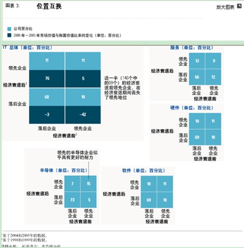 我們對(duì) 20 年來(lái)的高科技環(huán)境和經(jīng)濟(jì)周期進(jìn)行了廣泛研究,這些研究構(gòu)成了本文的宏觀分析基礎(chǔ)。 為了解哪些因素導(dǎo)致了高科技企業(yè)競(jìng)爭(zhēng)地位的變化,我們更為集中地分析了 1995年~2005 年間(當(dāng)然涵蓋 2000年~2002 年高科技業(yè)非常嚴(yán)重的低迷期)全球 12 個(gè)子行業(yè)的上市企業(yè)1 的業(yè)績(jī)。 我們按照市凈率值和投入資本回報(bào)率 (ROIC) 對(duì)688 家企業(yè)進(jìn)行了排名,并將其歸入“領(lǐng)先企業(yè)”(在以上兩方面均占據(jù)前 20% 的位置 )或“落后企業(yè)”(剩余 80% )之列。然后,我們對(duì)2000 年~2002 年經(jīng)濟(jì)衰退期間和隨后的恢復(fù)期間這些企業(yè)市場(chǎng)地位的變化情況,繪制了圖表。市場(chǎng)地位的變化指 從領(lǐng)先企業(yè)變?yōu)槁浜笃髽I(yè),或從落后企業(yè)變?yōu)轭I(lǐng)先企業(yè)等。