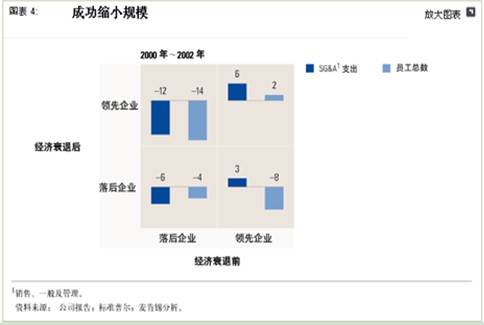 一躍而為領(lǐng)先企業(yè)的落后企業(yè)采用了不同的方法:與依然落后的企業(yè)相比,在整個(gè)經(jīng)濟(jì)衰退期間,前者的 SG&A 開(kāi)支降低幅度要高6%,員工總數(shù)降低幅度要高10%。盡管部分保持領(lǐng)先地位的企業(yè)也進(jìn)行了裁員,但它們的裁員幅度較小,并且集中在經(jīng)濟(jì)衰退的早期。