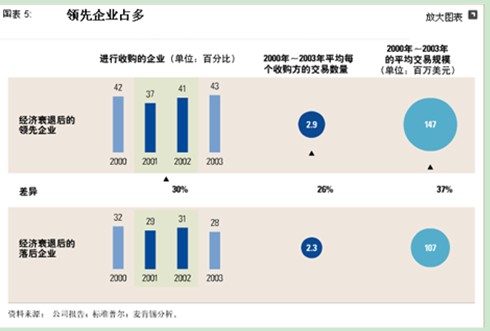 盡管存在上述收購(gòu)傾向,領(lǐng)先企業(yè)還是利用2000年~2002年的經(jīng)濟(jì)衰退精簡(jiǎn)了它們所廝殺的戰(zhàn)場(chǎng)的數(shù)量。與落后企業(yè)相比,這些企業(yè)剝離非核心業(yè)務(wù)的可能性要高50%,它們?cè)谑S鄻I(yè)務(wù)領(lǐng)域提高了自己的總體地位。