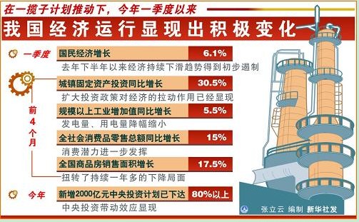 ——一季度國民經(jīng)濟(jì)增長6.1%,去年下半年以來經(jīng)濟(jì)持續(xù)下滑趨勢(shì)得到初步遏制;