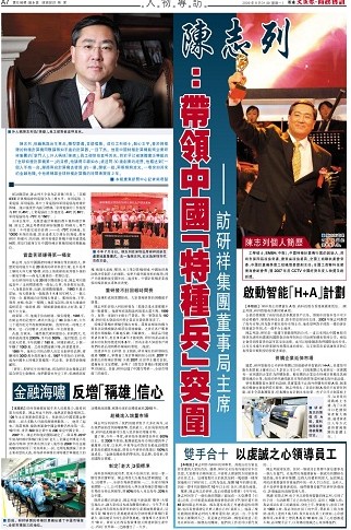 熟讀「經(jīng)營之神」松下幸之助管理書籍的陳志列,引用了松下的一句話解釋了自己的角色定位:當(dāng)員工100人時,我必須站在員工的最前面,身先士卒,發(fā)號施令;當(dāng)員工增至1000人時,我必須站在員工的中間,懇求員工鼎力相助;當(dāng)員工達到1萬人時,我只有站在員工的后面,心存感激即可;如果員工增到5萬到10萬時,除了心存感激還不夠,必須雙手合十,以拜佛的虔誠之心來領(lǐng)導(dǎo)他們。