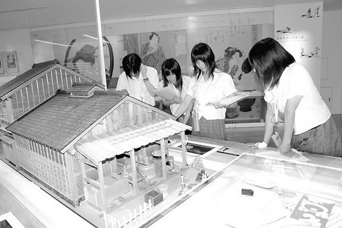 日本的企業博物館也是日本的中小學生進行課外學習的重要場所。圖為幾位日本女中學生在花王博物館內的古代公共澡堂的模型前駐足并利用電腦視頻觀看當時人們的生活情景。