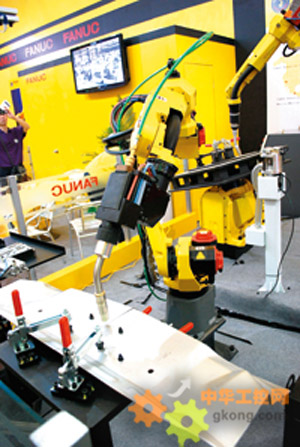 此次ESSEN展會,我們推出了一系列的新產品,以R-2000iB/210F為例,這是一款通用型的機器人,除了應用在汽車行業外,也可應用在加工中心和鉆銑中心等加工生產中,并且能自動給機床上下料。發那科機器人還配備了專門的視覺系統,過去,在機床上下料的過程中,要想準確地確定工件的位置,只能依靠卡具來保證,效率非常低,有了視覺系統后就大大提高了機加工的智能化功能。此外,機器人進行焊接的時候會有設定的行走軌跡,當工人把工件安裝完成之后,機器人就按照設定的軌跡運動,此時如果工件的位置發生偏差,機器人就會按照行走軌跡自動修正路徑進行焊接,減少了卡具的使用,使生產效率大大提高。