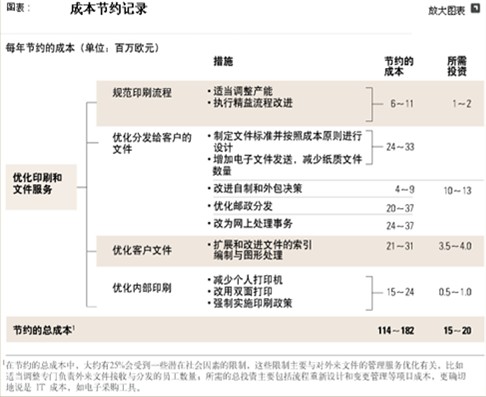 對于各個行業(yè)的許多機構(gòu)而言,統(tǒng)一的文件服務(wù)策略都可以節(jié)約巨大的成本(見圖表)。在目前嚴(yán)峻的經(jīng)濟形勢下,這一策略很適合那些希望顯著降低成本,但又難以進(jìn)一步縮減投資的企業(yè)。除了切實的成本節(jié)約外,這種結(jié)構(gòu)還會產(chǎn)生其他價值。比如,當(dāng)公司對營銷材料中的可視標(biāo)識和語言進(jìn)行標(biāo)準(zhǔn)化以后,品牌變得更有感染力。在美國,金融服務(wù)業(yè)的客戶宣傳材料受到高度監(jiān)管,因此更出色的文件管理模式還可以降低違規(guī)風(fēng)險。