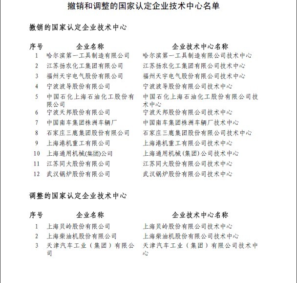 撤銷和調(diào)整的國家認(rèn)定企業(yè)技術(shù)中心名單