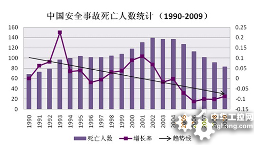 據預測,“十二五”期間,中國的安全生產形勢仍然十分嚴峻,最近三年來平均每年有近10萬人因各種安全事故而喪生,一共發生了90余起安全事故,這表明生產安全的基礎十分薄弱,技術條件落后,預防能力低,同時缺乏緊急事故處置的相關法規和法律。上圖列出了近20年來中國安全事故死亡人數的統計,可以看出,近10年來增長率呈下降趨勢,但因事故死亡人口總數仍然處于高位。十二五時期我國的總體目標是形成并改進安全生產體系,到2015年,要降低單位GDP安全事故死亡率到37%。如此艱巨的任務并無捷徑可行,因此可以預測,安全設備領域的投資仍將增長,整個石化緊急安全控制系統的市場前景十分光明。