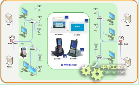 309醫院所采用的研祥邁康MCA移動醫療系統是在無線網絡環境基礎上,整合HIS、PACS、EMR、LIS等醫療信息系統,以研祥技術為核心,集成Wifi、3G、Bluetooth、RFID、條碼掃描、視頻、特種計算機等技術的一種輕便專用醫療終端。醫生、護士通過無線/LAN網絡與外圍的各種醫療儀器及HIS、PACS、LIS等醫院信息系統調閱病人信息,這樣就實現了醫護人員隨時隨地的溝通交流、隨時隨地的病患監控、隨時隨地的調閱信息、隨時隨地的做出診斷。