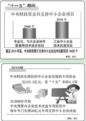 統計顯示,“十一五”期間,中央財政資金共支持中小企業專業化、與大企業協作配套等技術進步項目2468個,工業中小企業技術改造項目3978個。截至2010年底,中央財政累計支持了中小企業技術創新項目14450個。