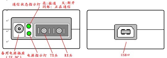 圖2 光口通信狀態指示燈以及電口(USB)插座