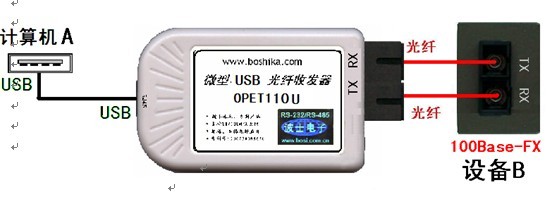 典型應用:終端計算機A通過USB線連接到USB光纖收發器的USB口;設備B為光纖到戶的的光口(100Base-FX標準),它通過兩根光纖連接到USB光纖收發器的光纖接口,即可實現光纖到用戶的桌面。