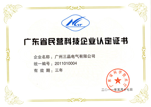 經省科技廳審查,認定三晶電氣為廣東省民營科技企業。獲此榮耀意味著三晶電氣已被省、市政府等職能部門認可為科技先導型企業,也充分說明三晶變頻器受到市場及客戶的認可。