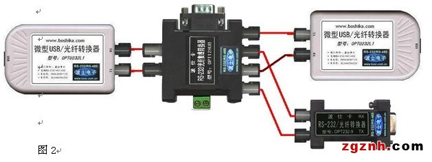 由于OPTU232L1(或OPTU232SL1)傳輸?shù)倪€是串口信號(hào),所以必須成對(duì)使用或者與波仕的其他串口/光纖轉(zhuǎn)換器配對(duì)使用。由于采用光纖作為通信傳輸介質(zhì),具有隔離高電壓、防電磁干擾、傳輸距離遠(yuǎn)等優(yōu)點(diǎn)。OPTU232SL1的傳輸介質(zhì)為單模光纖、OPTU232L1的傳輸介質(zhì)為多模光纖,但是外形和驅(qū)動(dòng)程序是完全一樣的。這種方案大大簡(jiǎn)化了USB口的光纖遠(yuǎn)程通信,圖2為OPTU232L1與波仕的串口/光纖中繼轉(zhuǎn)換器組網(wǎng)通信圖。兩邊的計(jì)算機(jī)都配置好USB/串口光纖轉(zhuǎn)換器并且連接好后,用“串口調(diào)試助手”軟件或者其他串口通信軟件就可以傳輸數(shù)據(jù)和文件了。