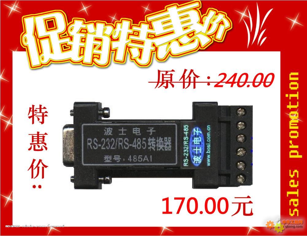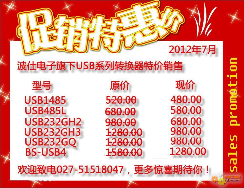 武漢波仕電子7月大優惠,為了感謝廣大新老客戶對波士的支持、好評,波士電子優惠酬賓活動:USB口轉換為1個RS-485(USB1485)、USB轉RS232/RS485/422轉換器(USB485L)、隔離器型USB轉232/485、422轉換器(USB232GH2). USB高速隔離型串口轉換器(USB232GH3),高速隔離USB轉全信號RS232(USB232GQ),USB一擴4集線器(BS-USB4)等產品,新老客戶均有優惠,歡迎前來采購下單。