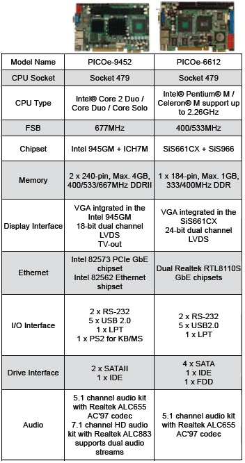 PICOe-9452采用ntel® Socket479 Core 2 Duo, Core Duo/Solo CPU插槽,采用Intel® 945GM + ICH7M芯片組,F(xiàn)SB最高可達667MHz ,2根DDRII內(nèi)存插槽最大可支持到4GB。PICOe-9452還支持雙千兆以太網(wǎng)、5個USB2.0、2個SATAII接口、LVDS接口。配合最新的PICOe底板,PICOe-6612LVDS可擴充4個32位標準PCI插槽和多個PCI-E x4、PCI-E x1插槽。