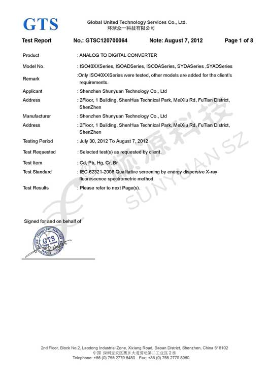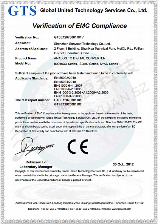 2012年10月通過EMC測試獲得CE認證,2012年8月通過RoHs無鉛環保認證。