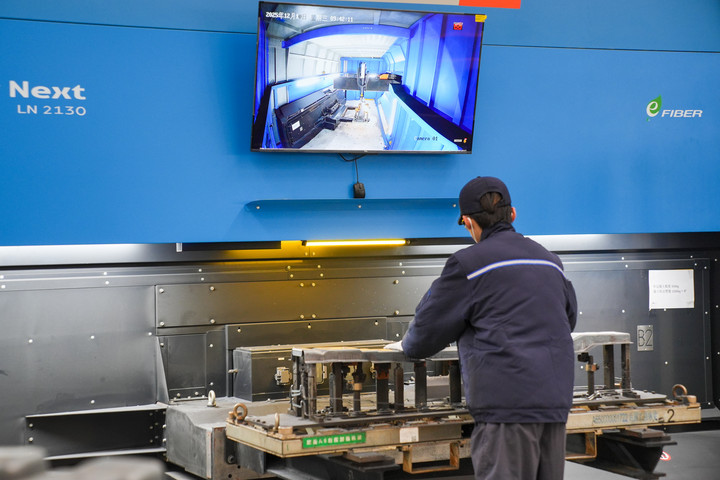 在山東睿航科技有限公司車間里,三維激光切割工序員工在進行切割前的上件準備。 王建煒 攝