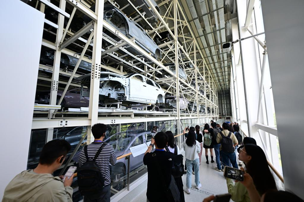 在合肥市新橋智能電動汽車產(chǎn)業(yè)園蔚來第二工廠,媒體記者參觀“魔方”車輛存取平臺。 新華社記者 周牧 攝