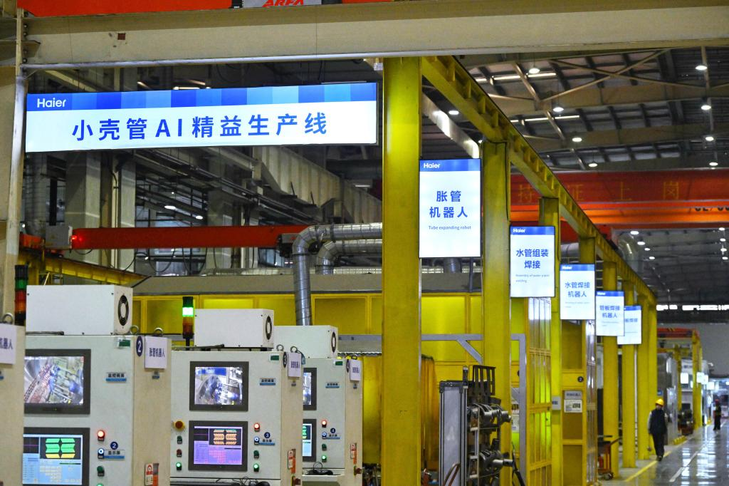 圖為青島海爾中央空調(diào)互聯(lián)工廠內(nèi)一條正在運轉(zhuǎn)中的AI智能生產(chǎn)線。 新華社記者 李紫恒 攝