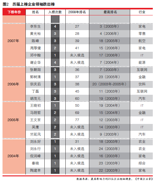 牛根生,乳業,5次入榜,2007年排名第4,2008年排名33,下榜。三聚氰胺事件令牛根生及蒙牛的品牌及影響力大大受挫。
