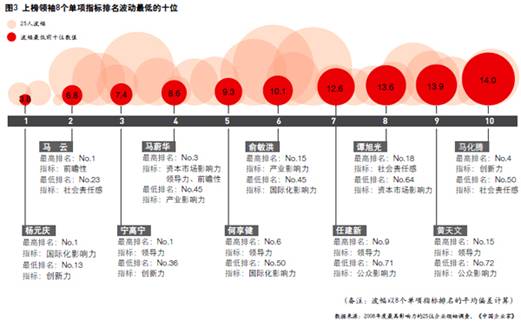 馬云,44歲,浙江杭州人,互聯網人士;馬蔚華,60歲,遼寧錦州人,金融業人士;楊元慶,44歲,浙江舟山人,IT人士;寧高寧,50歲,山東濱州人,新國企人士。所在籍貫不盡相同,所在行業也無類似,惟一相似的就是他們擁有一種均衡發展的力量。從數據上看,這四位領導者的評委得分都相當的均衡,8項指標的單項排名幾乎都在所有候選人排序中的前25位之內,計算出來的波幅都不超過10,相對來說波動很小,而其余上榜人員所有的單項排名距離這個標準都相差較遠,每一位至少都有兩項跌出25。(見圖3)