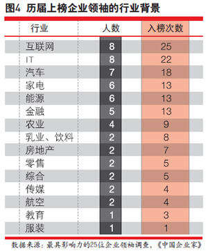 歷數六屆上榜企業領袖,粗略計算來自15個行業:互聯網最具優勢,有8人25次入榜,IT業有8人22次入榜;其次是汽車業,7人18次入榜;接下來是家電業、能源、金融業等(見圖4)。優勢明顯的行業也是競爭最激烈的行業,稍不留神,就有被替代的危險。比如互聯網,前幾年是張朝陽、丁磊、陳天橋等的時代,而最近幾年的風云人物則換成了馬云、馬化騰、李彥宏、史玉柱等。再看看家電業,2003年是倪潤峰、陶建幸、李東生群雄爭霸,近兩年則是何享健、周厚健笑看風云。