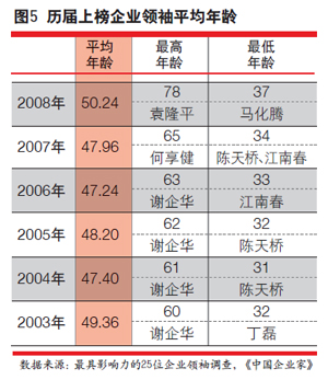 時間是個稀缺資源,企業家精神同樣是稀缺資源。企業家價值在于他為社會創造的價值,但這種創造的價值卻是隨時間的延續來實現的。要想成長為一個真正的企業領袖,漫長時間積累的背后,更包含著商業智慧、價值觀、文化等“軟實力”的積累。入榜企業領袖的最高年齡和最低年齡都有逐年增加的趨勢。尤其最近兩年,盡管富豪榜上年輕的富豪越來越多,年輕的企業領袖卻似乎越來越稀少。