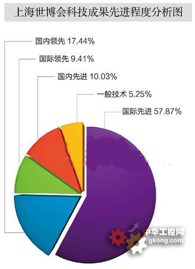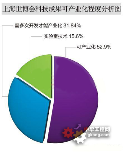 經有關專家評鑒,這500多項科技成果,從先進程度分析,國際先進和國內領先的分別占57.87%和17.44%,占3/4強;另有9.41%則更為先進,是國際領先;而10.03%在國內有一定先進性,剩下的5.25%是很一般技術。從可產業化程度分析,52.9%可產業化,31.84%需要二次或更多次開發后才能產業化,15.6%僅僅是實驗室技術。顯然,推動世博會科技成果轉化應用,非常有價值,也比較可行。