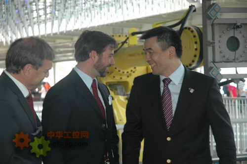 上圖“親切交談”——中:盧森堡大公國紀堯姆大公儲殿下;左:盧森堡大公國經濟與外貿大臣 右:上海發那科機器人總經理錢暉先生