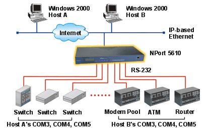 不同的主機電腦可以共享1個NPort 5610來控制不同的設備。例如,第1、2、3口可設置為主機A的COM3、COM4和COM5,而第14、15、16口可設置為主機B的COM3、COM4和COM5。使用NPort 5610,讓您可以達到同時集中管理串口設備,并于網絡中分散管理主機的目的。