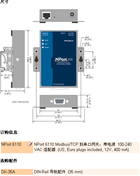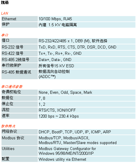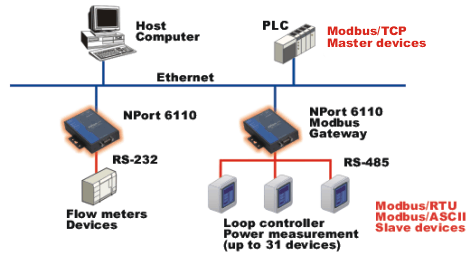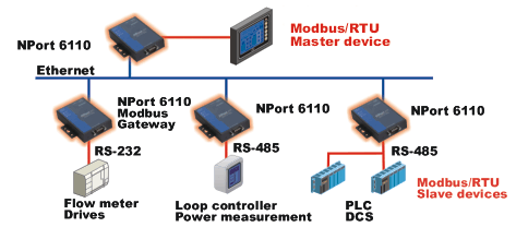 NPort 6110 支持一個以太網(wǎng)和一個可軟件選擇的RS-232/422/485 口來連接各種類型的支持 Modbus協(xié)議的設備。通過Modbus/TCP (Ethernet) 和 Modbus /ASCII/RTU (Serial) 協(xié)議轉(zhuǎn)換, 帶有以太網(wǎng)的 PLC可以使用 RS-232/422/485 接口來實現(xiàn)與儀器的無縫通訊。