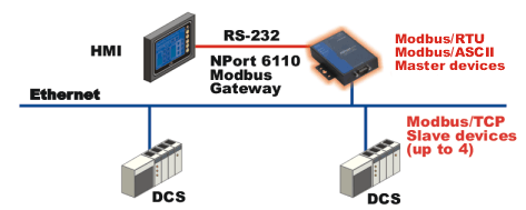 許多 HMI (人機界面) 系統(tǒng)使用串行接口,要求對分散的DCS系統(tǒng)進行存取。然而,越來越多的DCS系統(tǒng)支持以太網(wǎng),并且運行在Modbus/TCP 從模式下。為此, NPort 6110 Modbus 網(wǎng)關是通過以太網(wǎng)連接HMI到分散的 DCS系統(tǒng)的理想解決方案。每個NPort 6110最多支持4個 Modbus/TCP 從設備。