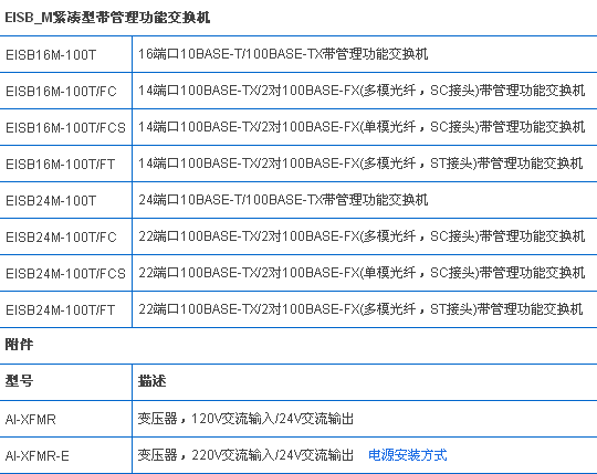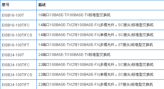 科動德國分公司生產的該系列工業以太網交換機,提供8-24接口的全系列產品,從即插即用型到高端的管理型(管理型EISB_M系列產品支持各種管理功能,可組成冗余的快速環網,恢復時間<300ms),品種非常齊全。DIN軌或面板安裝、使用冗余的低壓電源、ST/SC接頭單模或多模光纖可選。